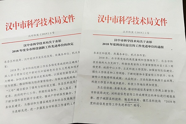 近日,勉县科技局被授予2018年度“全市科技创新工作先进单位”和“全市科技信息宣传工作先进单位”两项荣誉称号。
